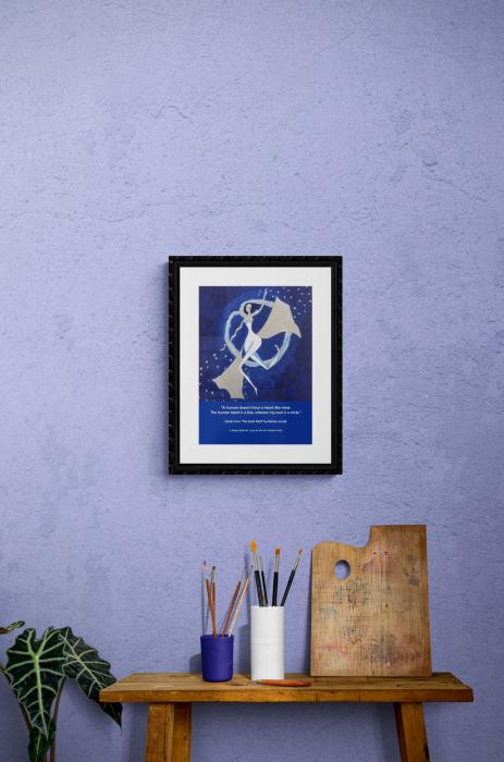 Den repræsenterer Døden, en af de mest ikoniske karakterer fra bogen. Jeg tilføjede et par abstrakte vibrationer og en himmelsk aura til karakteren. Her er citatet, der inspirerede mit kunst: "Et menneske har ikke et hjerte som mit. Det menneskelige hjerte er en linje, hvorimod mit eget er en cirkel, og jeg har den uendelige evne til at være på det rigtige sted på det rigtige tidspunkt. Konsekvensen af dette er, at jeg altid finder mennesker på deres bedste og værste. Jeg ser deres grimme og deres skønhed, og jeg undrer mig over, hvordan det samme kan være begge dele. Alligevel har de én ting, jeg misunder. Mennesker har, om ikke andet, den sunde fornuft at dø." Døden, Bogtyven af Markus Zusak Den originale maleri er 40x40 cm, acrylic på lærred, og tilhører en privat samler.