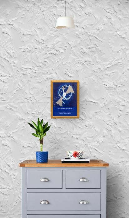 Den repræsenterer Døden, en af de mest ikoniske karakterer fra bogen. Jeg tilføjede et par abstrakte vibrationer og en himmelsk aura til karakteren. Her er citatet, der inspirerede mit kunst: "Et menneske har ikke et hjerte som mit. Det menneskelige hjerte er en linje, hvorimod mit eget er en cirkel, og jeg har den uendelige evne til at være på det rigtige sted på det rigtige tidspunkt. Konsekvensen af dette er, at jeg altid finder mennesker på deres bedste og værste. Jeg ser deres grimme og deres skønhed, og jeg undrer mig over, hvordan det samme kan være begge dele. Alligevel har de én ting, jeg misunder. Mennesker har, om ikke andet, den sunde fornuft at dø." Døden, Bogtyven af Markus Zusak Den originale maleri er 40x40 cm, acrylic på lærred, og tilhører en privat samler.